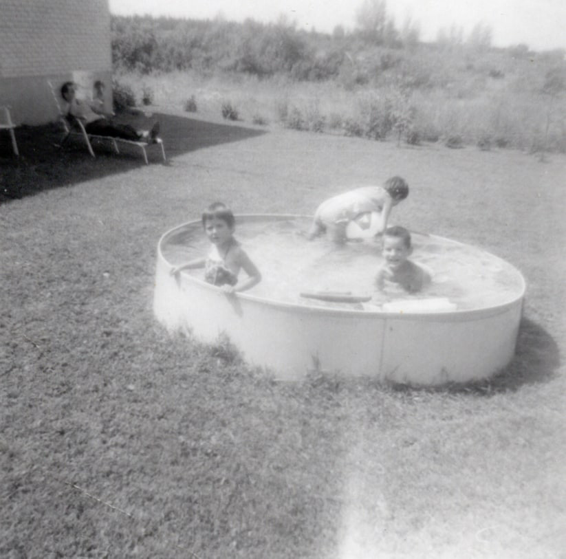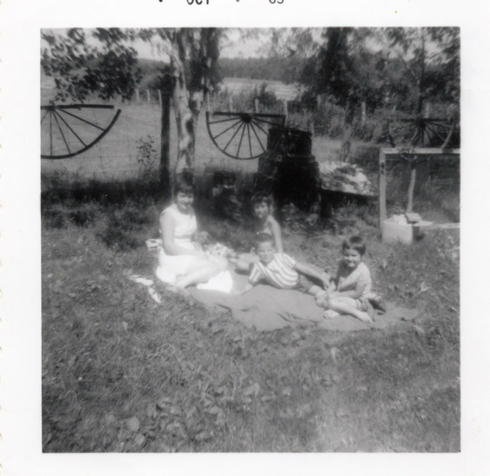 France et Guy (Diane à l'arrière?). Au fond, Jacques lisant son journal à l'ombre.