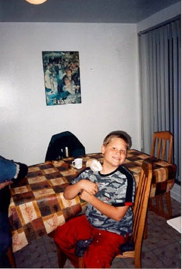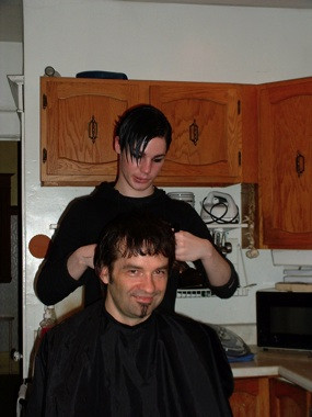 Yannis coupant les cheveux de son oncle Guy.
